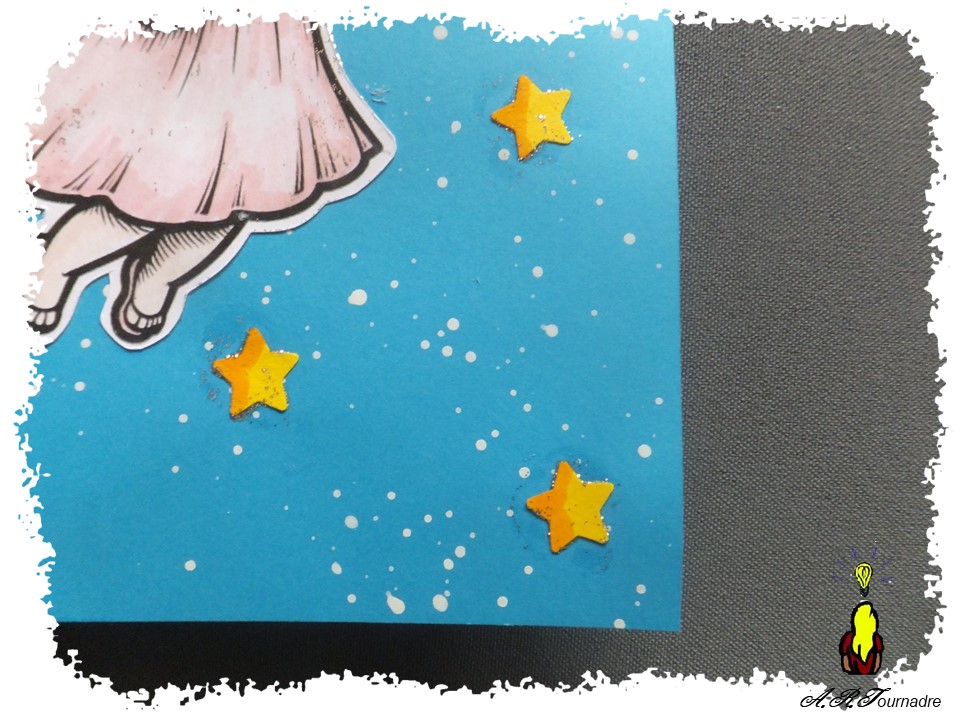 J’ai colorié mon sujet aux feutres à alcool avant de rajouter une couche de « giltter », ou gel pailleté, pour rendre les ailes plus lumineuses.