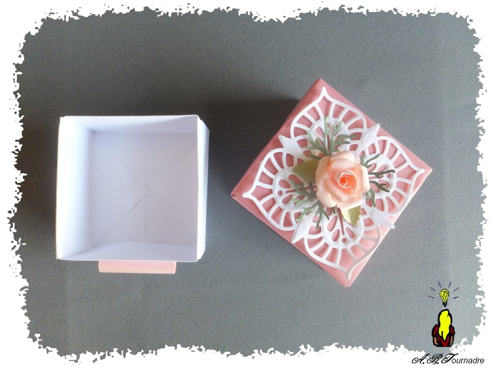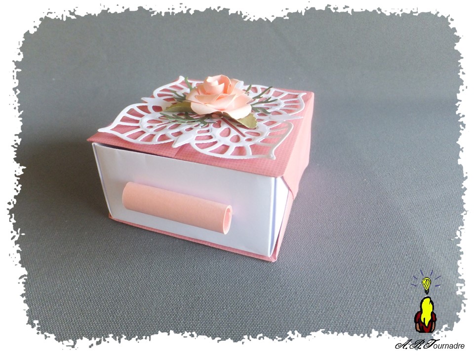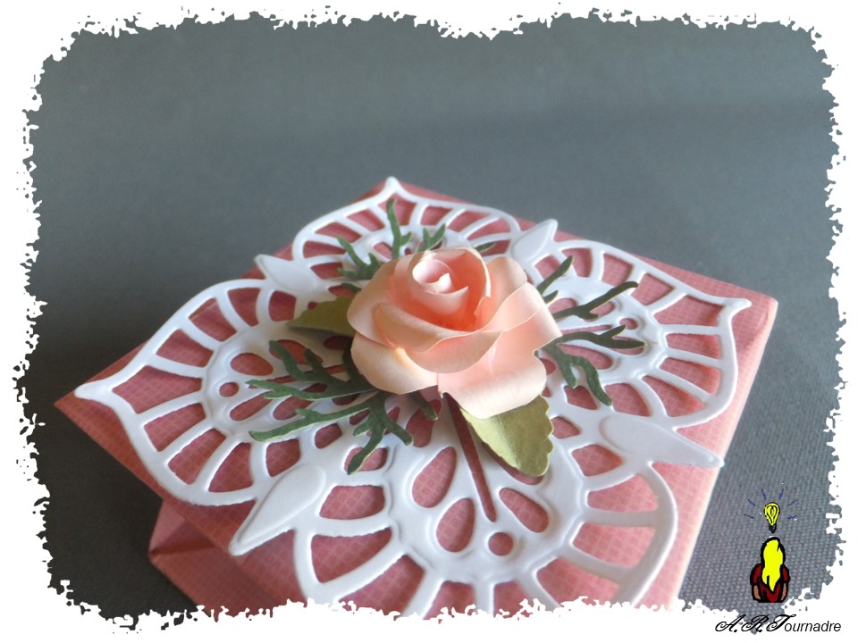 Et mon petit plus concerne la décoration de la boite, réalisée à partir d’une rose à la perforatrice selon ce tutoriel.
