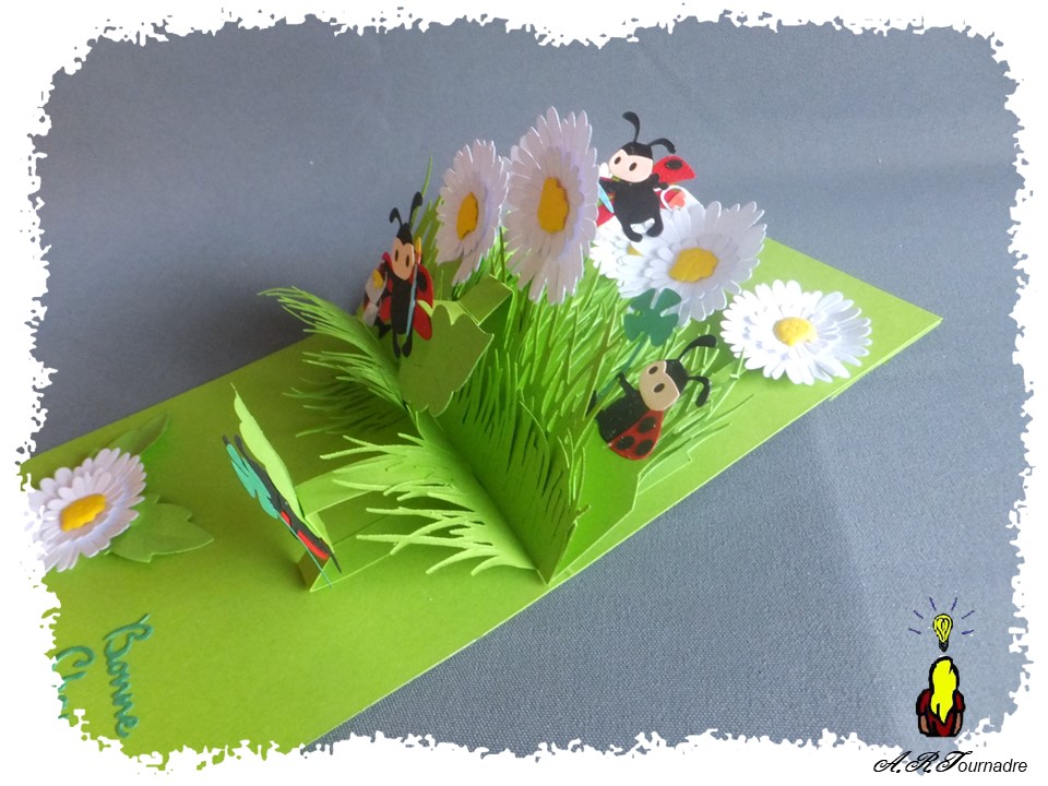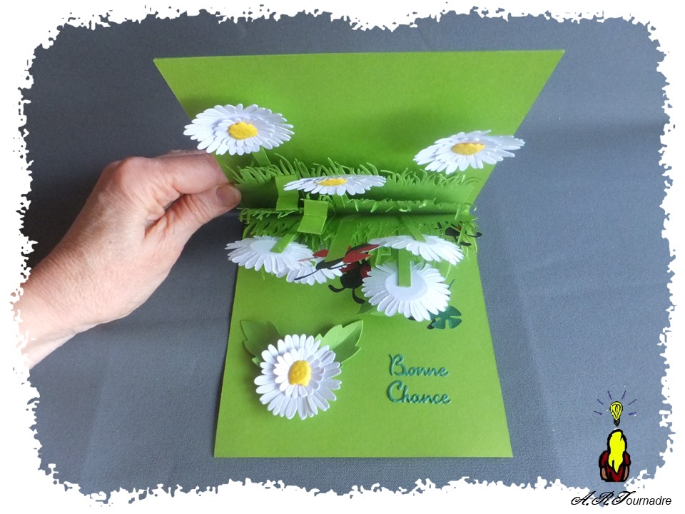 Evidemment, comme à mon habitude j’ai adapté le classique tutoriel de la « carte en éventail » en semant de l’herbe sur toute la largeur de ma carte pop-up et en décalant les fleurs pour un rendu plus « naturel ».