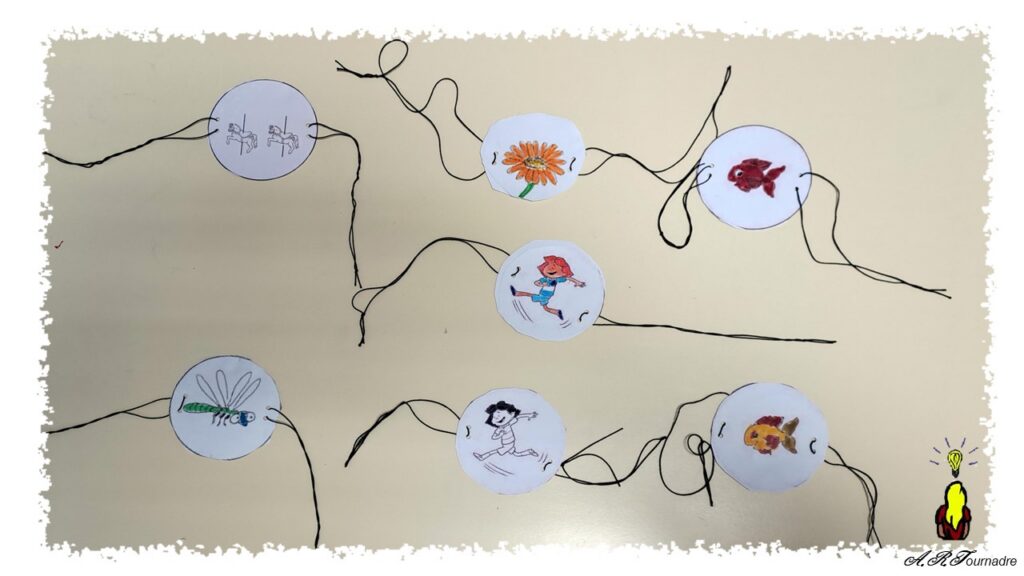 Alors j’ai décidé de proposer au dernier cours juste avant les vacances, de colorier un thaumatrope pour jouer ensuite avec dans la cours de récréation.