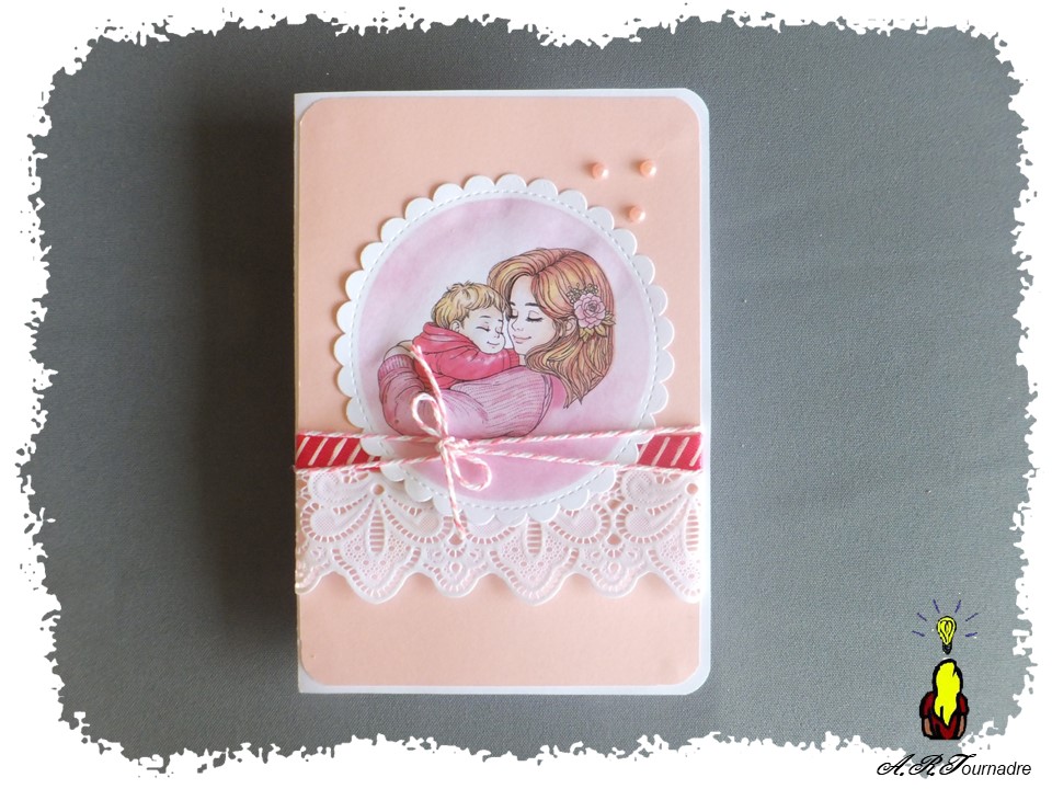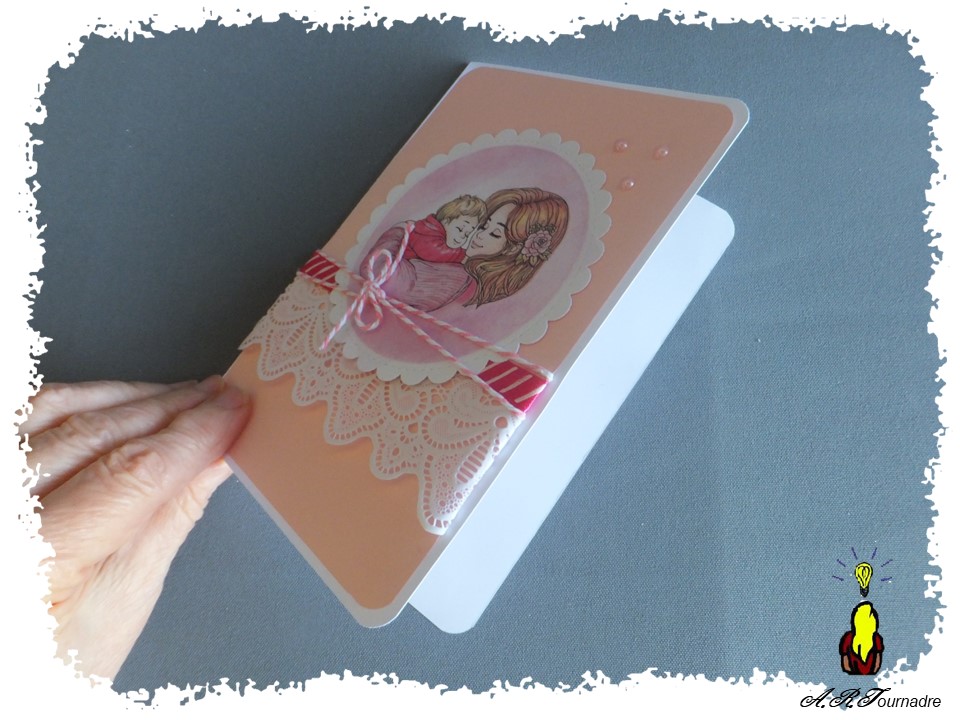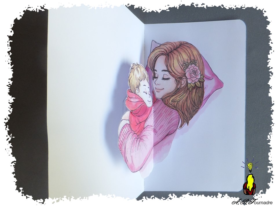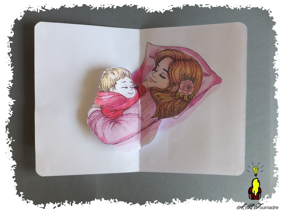 Voici une carte pop-up conçue et réalisée sur mesure à partir d’un coloriage du net pour une collègue future Maman