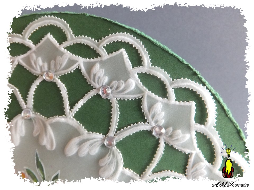 Tout d’abord j’ai dessiné le motif à l’embossoir fin de 0,5 mm avant d’élargir les arcades avec des embossoirs de plus en plus gros.