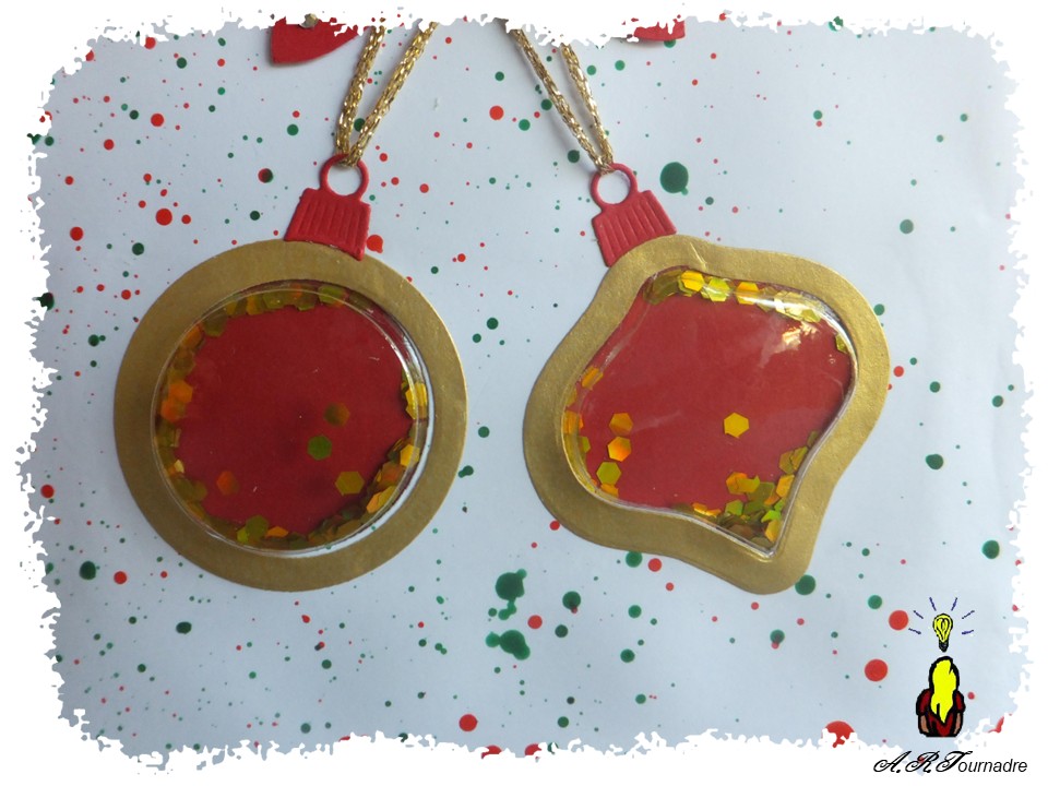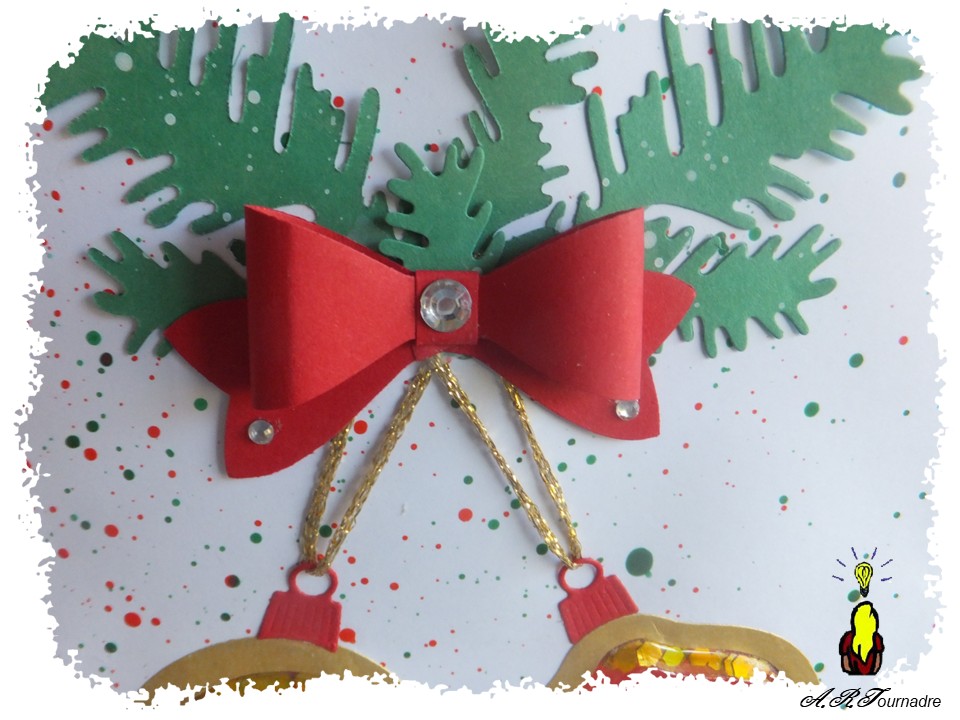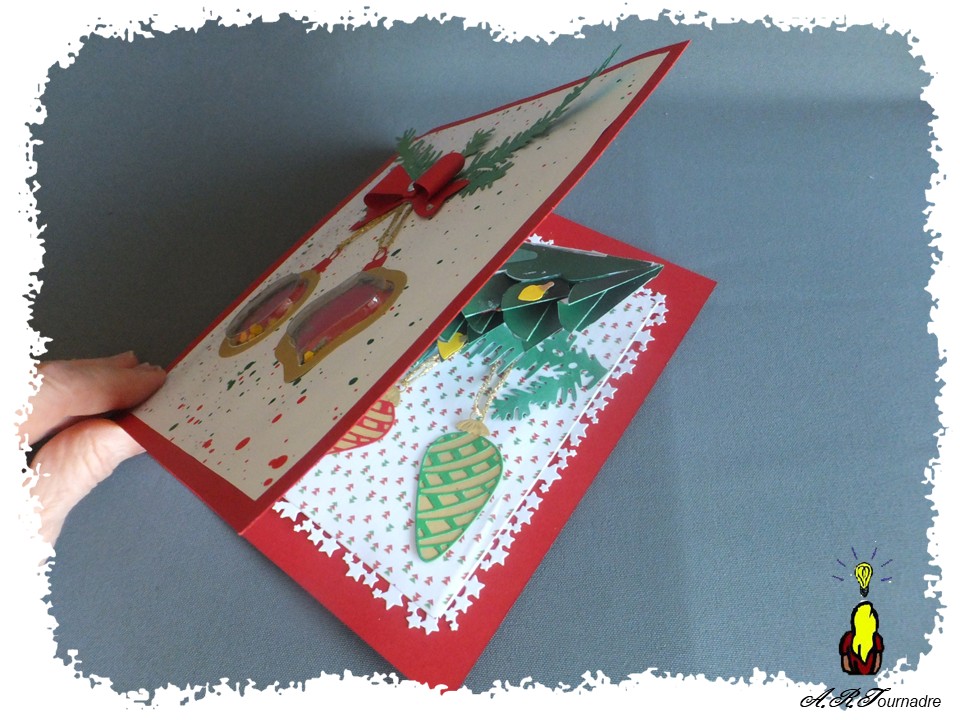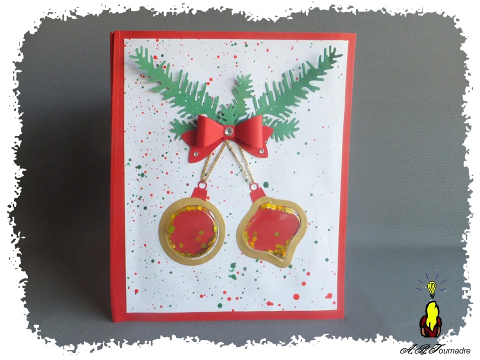 Les boules de Noël sont des shaker de Studio Ligth assortis aux dies qui ont permis de les intégrer dans la carte.